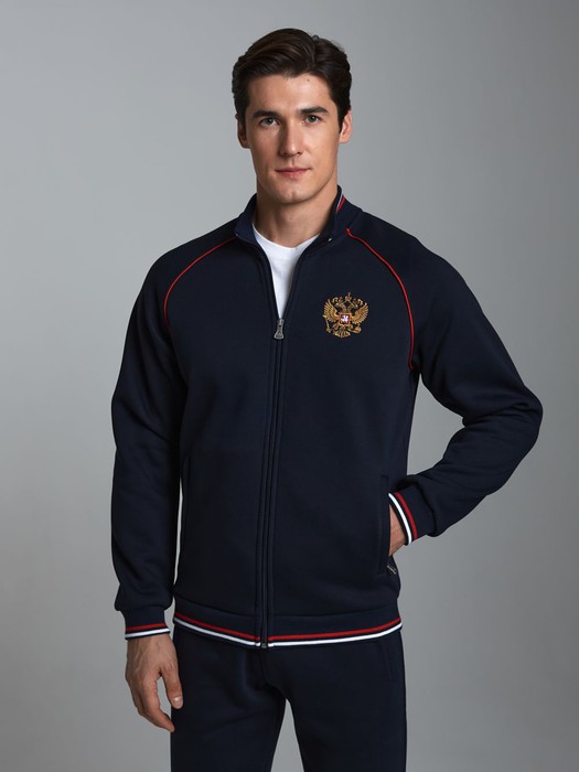 Спортивный костюм из хлопкового трикотажного полотна с начесом. Куртка на поясе с воротником, застегивается на молнию. Рукава покроя реглан, шов втачивания рукавов выделен красным кантом. Карманы куртки прорезные с планками, застегиваются на молнию . На груди куртки слева - вышивка - герб России.. Воротник, манжеты и пояс куртки выполнены из полосатого эластичного трикотажа. Брюки прямые, с прорезными карманами на молнии .Пояс брюк эластичный, по линии талии дополнительно регулируется шнурком.