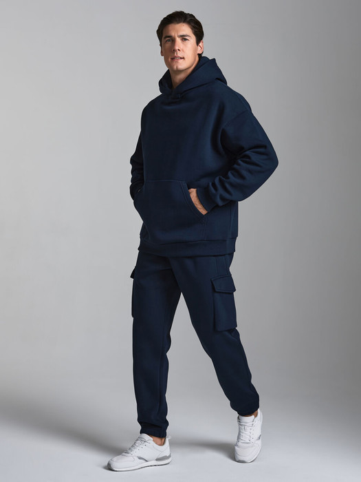 Мужской спортивный костюм из плотного трикотажа с изнаночным начесом. Верх комплекта - толстовка-худи с капюшоном, с накладным карманом "кенгуру". Рукава толстовки втачные, свободные со спущенной линией плеча, с эластичными манжетами. Брюки "Карго" с объемными накладными карманами, с клапанами, имеют два дополнительных кармана с молниями в боковых рельефах. Брюки к низу заужены на резинку. Пояс брюк эластичный, по линии талии дополнительно регулируется шнуром.