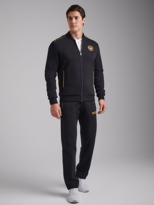 Спортивный костюм мужской, из хлопкового плотного трикотажа с начесом по изнанке. Куртка-бомбер свободного покроя, на поясе, с воротником, застегивается на молнию. Рукава покроя реглан, в плечевой шов реглана спереди вставлен золотистый кант. Прорезнные карманы куртки и брюк с планками, застегиваются на молнии. На спине куртки вышивка РОССИЯ, выполненная золотистыми нитями. На груди слева - вышивка герб РОССИИ. С левой стороны на брюках под карманом вышивка РОССИЯ. Пояс куртки, манжеты и воротник выполнены из плотного подвяза с рельефной полосой. Брюки прямые. Пояс брюк по линии талии с эластичной тесьмой дополнительно регулируется шнуром.