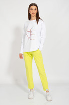 Свитшот свободного кроя, выполнен из трикотажной хлопковой ткани. Рукав втачной со спущенной проймой, низ рукава обработан довязом с нитью из люрекса, как на манжете, так и на горловине. V - образный вырез визуально удлиняет шею. Разрезные детали из контрастной расцветки выгодно создают нужные линии и зрительно вытягивают силуэт.