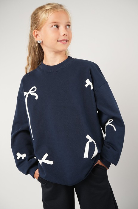 Синий свитшот с принтом бантики — тот самый вариант, который покорит сердце любой девочки! Теплый, стильный и удобный, он станет любимым в гардеробе. Базовый джемпер, который идеально подходит для подростка — прекрасный демисезонный вариант на осень и весну.