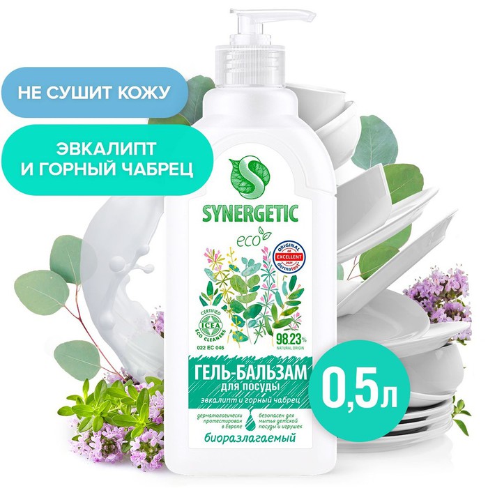 Биоразлагаемый гель-бальзам для посуды Synergetic "Эвкалипт и горный чабрец" предназначен для мытья всех видов посуды (в том числе детской), кухонного инвентаря и детских игрушек. Формула геля-бальзама — это баланс эффективного моющего средства и бережного отношения к коже при содержании 98,23% натуральных компонентов. Комплекс ПАВ из растительного масла и энзимов эффективно удаляет жир и сложные загрязнения даже в холодной воде.