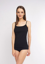 Топ выполнен из тонкого атласа. Топ прямого силуэта длиной выше линии бедер. По переду обработаны нагрудные вытачки. Топ на регулируемых бретелях из основной ткани. В боковых швах обработаны разрезы. Топ декорирован тесьмой-кружевом по горловинам переда и спинки, по боковым и по низу.
