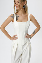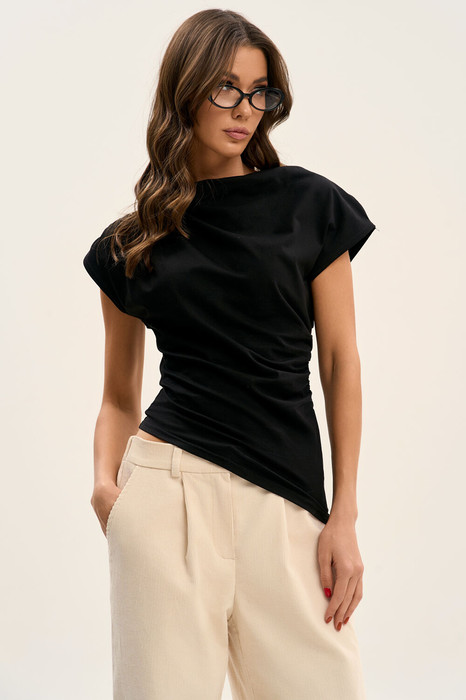 Топ с вырезом лодочкой без рукавов, ассиметричным низом и сборками - это ультрамодная вещь для вашего гардероба!