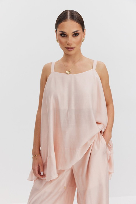 Блузка женская свободного А-силуэта из полупрозрачной блузочной ткани вуаль, длиной ниже уровня бедер, на притачных широких бретелях, регулируемых сзади с помощью «колец-протяжек». Спинка удлиненная, по низу блузки притачная широкая планка. Блузка на подкладке. Длина 67 см.