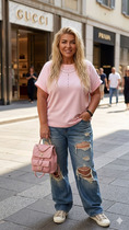 Топ эффектно смотрится благодаря вязке «английская резинка» и отлично пойдет для создания стильных образов.