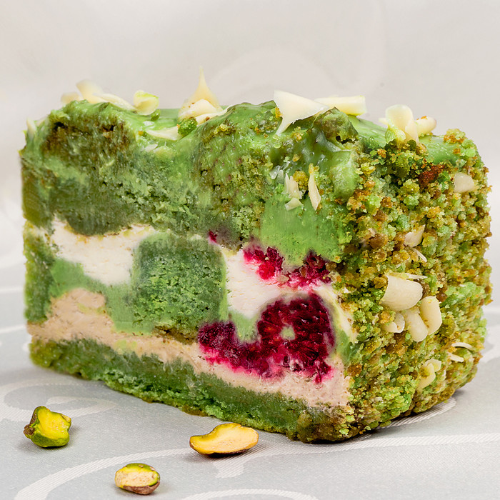 Вес 2,520г! Очень нам понравился, добавляю, рекомендую. Солоноватый вкус фисташки с нежным муссом и спелой малиной - невероятно сочный торт!