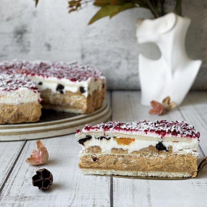 Между тремя ванильными бисквитами слой из арахисового ганаша с нугой и сметанный крем с кусочками чернослива и кураги. Торт покрыт нежным сливочным кремом и украшен малиновой крошкой.