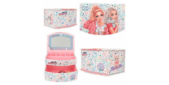 Маленькая шкатулка для украшений TOPModel Cutie Star с очень милыми звездочками по всей поверхности, забавными иконками попкорна, милыми котятами и стильным принтом модели имеет зеркало в откидной крышке, разделенное основное отделение и большой ящик со стразами на ручке. 10,8 х 15,5 х 8,5 см
