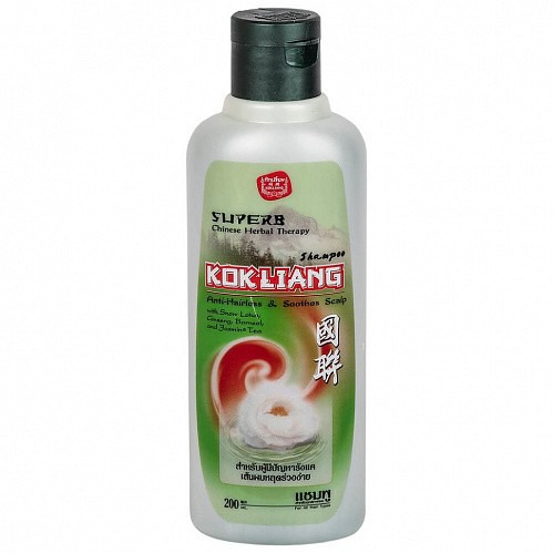 Травяной шампунь Kokliang предотвращает выпадение волос, помогает избавиться от перхоти, хорошо промывает волосы.Основные свойства шампуня Kokliang: 1 .Создает оптимальное питание клеток кожи головы и волос, 2. Помогает против перхоти, зуде кожи головы, 3. Помогает активировать спящие волосяные луковицы, 4. Увлажняет локоны по всей длине, 5. Питает кожу головы, оказывает омолаживающее и тонизирующее влияние, 6. Хорошо дезодорирует кожу головы, 7. Подходит для витаминизации и наилучшего питания клеток, 8. Борется с выпадением локонов, 9. Устраняет покраснения и зуд на коже., Активные компоненты:Борнеол — представляет собой эфирное масло, получаемое из камфорного дерева, глубоко проникает в клетки, усиливает обмен веществ и улучшает приток крови к луковицам, благодаря чему пряди начинают расти быстрее.Экстракт Женьшеня — содержащиеся в корне женьшеня смолы, алкалоиды и дубильные вещества, а также витамин С, сера и фосфор, эффективно останавливают выпадение волос, доставляя необходимые микро- и макроэлементы к луковицам волос.Экстракт Снежного Лотоса —  интенсивно увлажняет кожу головы, а также укрепляет клетки кожи, благодаря эффективному смягчающему и успокаивающему эффекту. Данный экстракт нашел широкое применение в косметических средствах, предназначенных для лечения проблем, связанных со здоровьем волос и кожи головы, является мощным источником алкалоидов, витаминов группы В и флавоноидов, стабилизирует процессы обмена веществ, регулирует процессы микроциркуляции крови и регенерации кожи.Экстракт Жасминового зеленого чая — придает волосам объем и густоту. Активные компоненты жасмина возвращают волосам шелковистость и естественный блеск. Кроме того, экстракт восстанавливает работу сальных желез и эффективно укрепляет корни волос, препятствуя их выпадению., Способ применения: Нанести массажными движениями на корни волос, хорошо помассировать кожу, распределить по длине волос и промыть теплой, проточной водой.