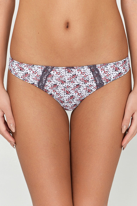 Трусики-стринги из эластичного принтованного материала и отделкой из кружева. Центральная часть отделана атласным бантиком.В комплект можно подобрать Бюстгальтер.