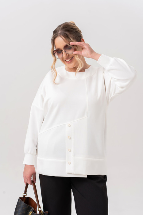 Позвольте себе насладиться комфортом и стилем с нашей туникой, которая станет вашим незаменимым спутником. Этот  стильный свитшот  предполагает легкость и свободу движений, что делает  идеальным для повседневной носки и прогулок на свежем воздухе. Изготовленный из качественного трикотажа, он обеспечивает дышащие свойства и гипоаллергенность, что особенно важно для женщин с чувствительной кожей. Туника с круглой, асимметричной горловиной и манжетами на запястьях добавляет образу женственности и утонченности. На полочке обработана нефункциональная, декорированная пуговицами планка. На спинке, в среднем шве, обработана потайная молния.Она легко сочетается с различными аксессуарами,юбкой,брюками и разной обувью, что дает возможность создавать разнообразные образы.