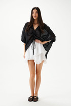 Передняя часть юбки с отрезной кокеткой и конструктивным элементом в виде драпировки и укороченного низа в области левой ноги. Задняя часть юбки со средним швом, в верхней части которго обработана потайная молния. Юбка на притачном поясе, с эластичной тесьмой и застежкой на петлю и пуговицу.