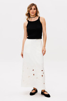 Юбка женская из легкой джинсовой ткани. Перед юбки со швом посередине, переходящим в разрез, с боковыми карманами закругленной формы. Спинка с кокеткой, средним швом и накладными карманами, правый карман с декоративной нашивкой. Застежка на тесьму молнию в переднем шве. Пояс притачной с эластичной резиной сзади, с застежкой спереди на петлю и джинсовую пуговицу.