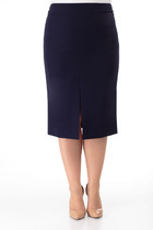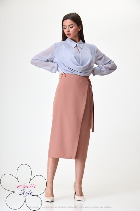 Юбка с элементом запаха, на притачном поясе. Выполнена из костюмной ткани в чёрном цвете, без подкладки. В новейших моделях запах располагается спереди сбоку. Это формирует изящный вырез треугольной формы, который смотрится очень женственно.