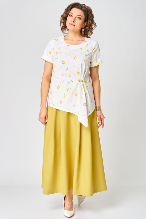 Юбка свободного силуэта, на широком притачном поясе, со вставками эластичной тесьмы. В боковых швах глубокие косые карманы. По переднему и заднему полотнищу юбки — складки.