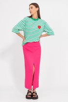 Юбка прямого кроя выполнена из текстильного полотна черного цвета. Характеристики: прямой крой, брендированная подкладка, пояс стабильный, застежка молния и пуговичка, по передней и задней части изделия вертикальные прямые рельефы. Длина юбки 47 см.