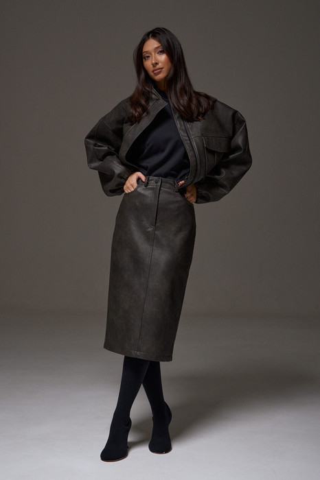 Юбка прямого кроя выполнена из экокожи. Характеристики: прямой крой, пояс стабильный со шлевками, на брендированной подкладке, застёжка центральная пуговица, молния, по передней части изделия прорезные карманы, по заднему полотну накладные карманы. Длина 75 см. В среднем шве разрез 32 см.