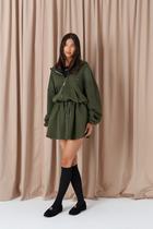 Юбка-мини, прямого кроя. Выполнена из полотна с длинным ворсом, кремового цвета с мелкими блестками. Пояс на резинке, есть подкладка. Длина 33 см