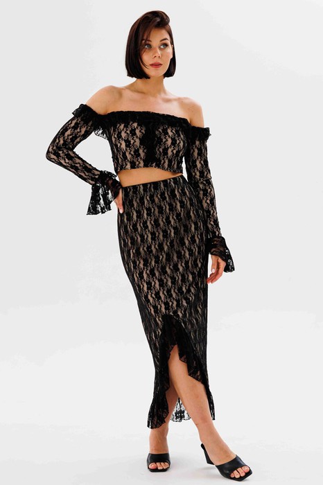 Юбка в длине миди, обработана птрикотажной эластичной подкладкой. Пояс на широкой резинке. По низу обработан волан из  гипюра. Перед юбки обработан фигурным разрезом.