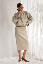 Юбка в длине миди, выполнена из эластичной синтетичекой кожи. Застёжка - гульфик с молнией, пуговица. По центру переда обработан разрез. По задним половинам настрочены накладные карманы. По переду обработаны втачные карманы.