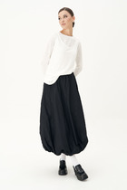 Юбка прямого силуэта, из текстильной ткани, верхний срез юбки обработан обтачкой, заднее полотнище со средним швом, застегивается на потайную молнию. Шов переходит к низу в шлицу. По переднему и заднему полотнищах обработаны таливые вытачки. Длина по боковому шву 66 см. Юбка на подкладке.