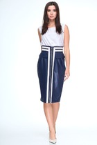 Юбка прямого силуэта, с фигурной кокеткой по переду и разрезом-шлицей. Заднее полотнище со средним швом, в котором обработана застежка потайная. Верх юбки обработан обтачками.  Длина по боковому шву 64 см. Юбка на подкладке.