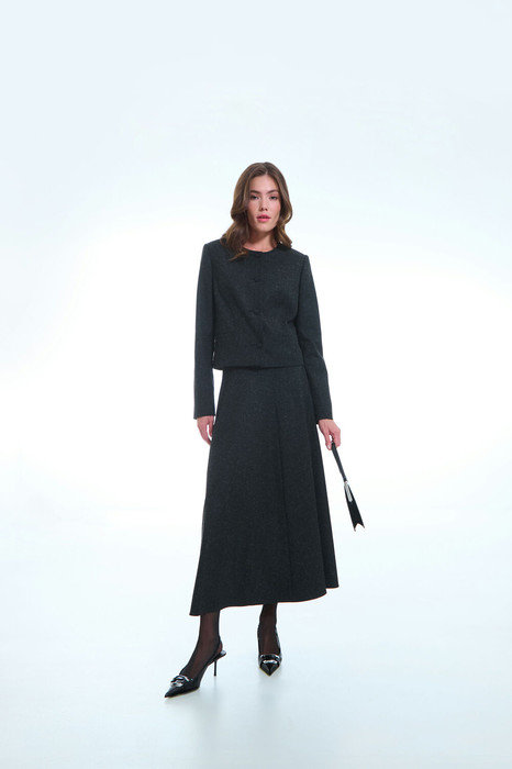 Эта женская юбка длины «миди» изготовлена с подкладкой для дополнительного комфорта и идеальной посадки. Модель имеет свободный крой, расширяющийся к низу, что придает силуэту женственность и легкость. Перед и спинка украшены аккуратным средним швом, добавляющим структуру и элегантность.