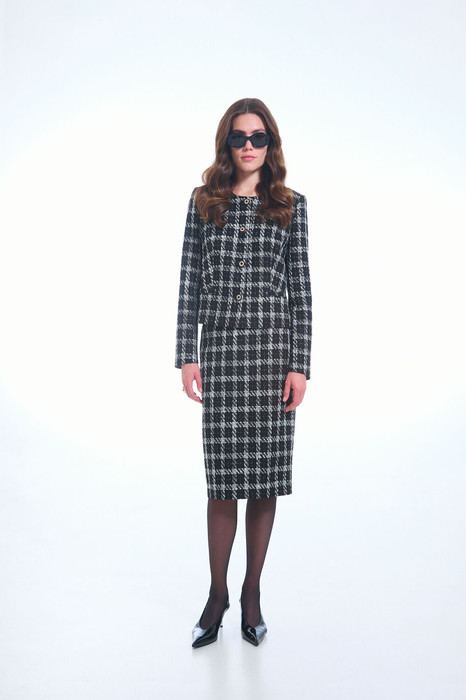 Юбка женская, прямая, длиной уровня колена. Застежка на потайную молнию и шлица в среднем шве заднего полотнища. Юбка на отлетной подкладке.