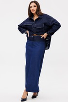 Юбка выполнена из сетки с цветочной аппликацией. Юбка прямого силуэта, длиной миди, на притачном поясе. Сзади в среднем шве шлица и застежка на потайную молнию. Юбка на отлетной по низу подкладке из атласа. В комплект входит съемный ремень из атласа.