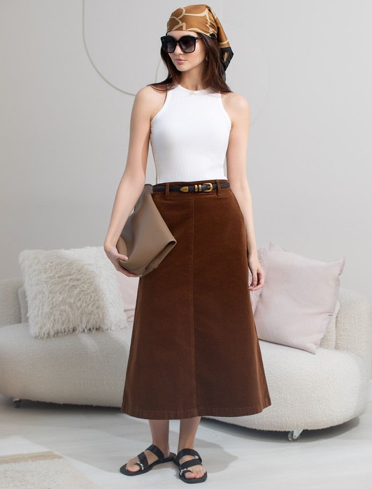 Состав: 98%Хлопок 2%ПУ Плотность: 310 Г/м2 Размер товара на первом фото: 42Юбка-миди трапециевидного силуэта выполнена из мягкого хлопкового микро-вельвета с добавлением эластана. Изделие комфортно садится по фигуре и не сковывает движения. Модель дополнена высококачественной фурнитурой с фирменным логотипом бренда. Хорошо комбинируется с вязаным трикотажем, блузками и денимом.Также прекрасно станет альтернативой деловым низам в нестрогом офисном дресс-коде.