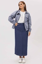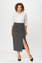 Юбка-карандаш женская из искусственной кожи. Длина юбки до середины икры. По переду в юбке обработаны карманы с отрезным бочком, по концам кармана установлены хольнитены. Перед юбки с центральным швом, в котором обработан гульфик с застежкой – молнией. Спинка юбки со средним швом в котором располагается разрез. Верх спинки юбки с отрезной фигурной кокеткой и вытачками. Верхний срез юбки обработан отрезным поясом, с резинкой по спинке и шлевками. Пояс застегивается на кнопку.