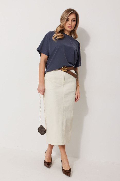 Юбка-карандаш женская из джинсовой ткани. Длина юбки до середины икры. По переду в юбке обработаны карманы с отрезным бочком, по концам кармана установлены хольнитены. Перёд юбки с центральным швом, в котором обработан гульфик с застежкой – молнией. Спинка юбки со средним швом в котором располагается разрез. Верх спинки юбки с отрезной фигурной кокеткой и вытачками. Верхний срез юбки обработан отрезным поясом, с резинкой по спинке и шлевками. Пояс застегивается на кнопку.