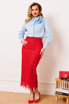 Юбка карандаш средней посадки с отрезным поясом выполнена из ажура с вишивкой на сетке, в качестве подкладки костюмная ткань с матовым блеском. Застежка на потайную молнию в среднем шве спинки, по низу разрез.