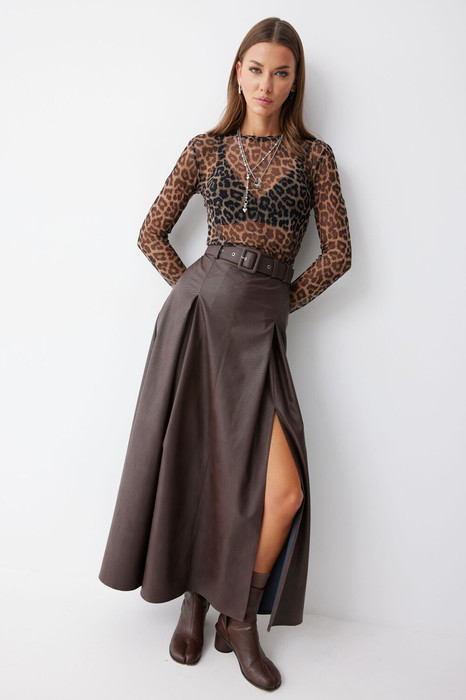Стильная юбка А-силуэта из экокожи , длины макси. По верху юбки притачной пояс с  шлевками для ремня.  На передних половинках расположены вытачки со встречной складкой и разрезами по низу. На задних половинках расположены талиевые вытачки. На спинке по центру потайная молния. В комплект входит ремень.