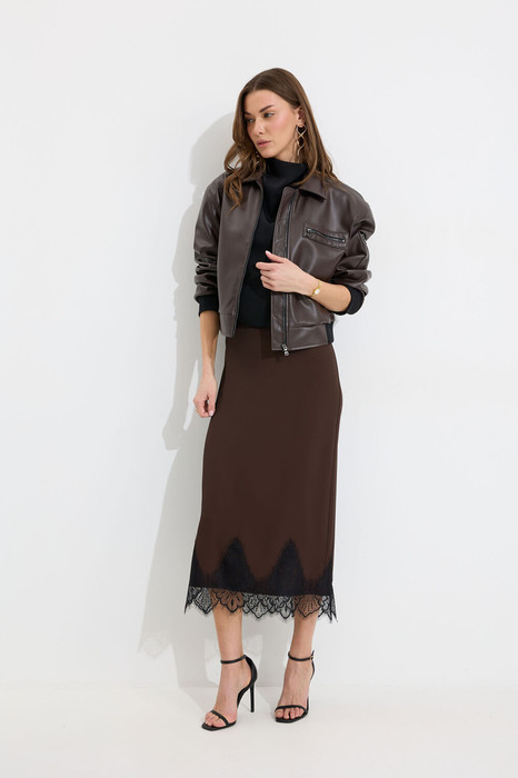 Юбка прямого силуэта из струящейся ткани. По верху юбки притачной пояс с резинкой по задней половинке пояса от бокового шва до вытачки. В центральном шве потайная молния, по низу разрез. По низу юбки декоративная тесьма( кружево).  Обращаем ваше внимание, что фурнитура может отличаться от фото.