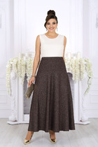 Юбка - солнце макси с узким поясом. В боковых швах расположены карманы. Застёжка на петлю и пуговицу и молнию по спинке.