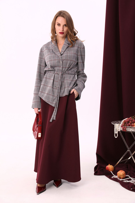 Юбка - солнце макси с узким поясом. В боковых швах расположены карманы. Застёжка на петлю и пуговицу и молнию по спинке.