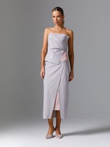 Модель прямого силуэта, без подклада. Сзади в среднем шве обработана потайная застёжка молния и шлица. Перед комбинированный, с имитацией запаха. Низ разноуровневый. Юбка декорирована брошью и швами с открытыми срезами.