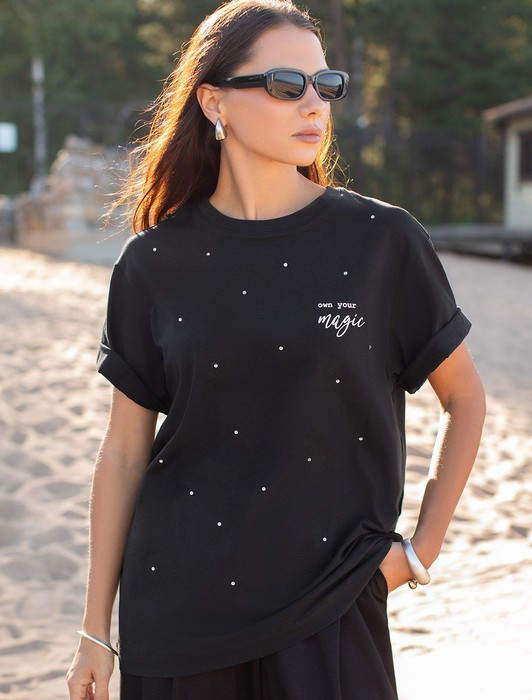Удлиненная футболка over-size с принтом стразами