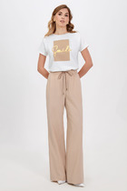 Брючины слегка заужены к низу, на щиколотках — плотные манжеты, благодаря которым обладательницам этих брюк не страшны ни снег, не холодный ветер. Пояс -резинка, внутри имеется шнурок для регулировки талии, два боковых кармана на молнии.