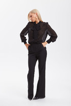 Брючины слегка заужены к низу, на щиколотках — плотные манжеты, благодаря которым обладательницам этих брюк не страшны ни снег, не холодный ветер. Пояс -резинка, внутри имеется шнурок для регулировки талии, два боковых кармана на молнии.