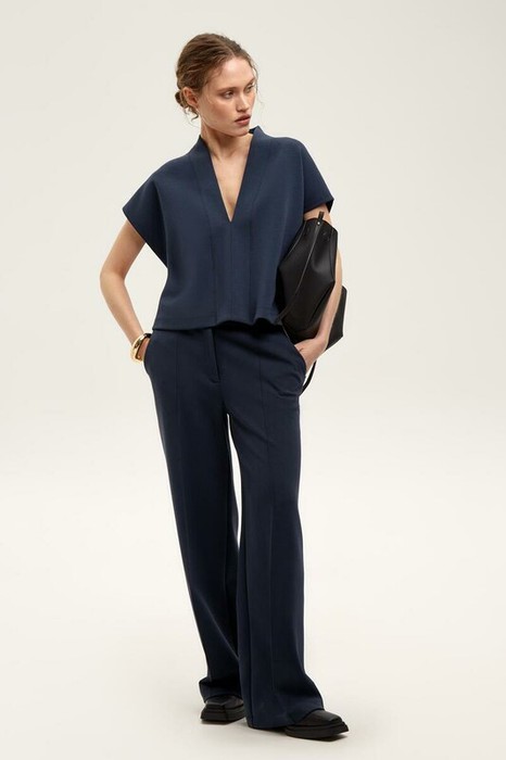Брюки свободного кроя из премиального трикотажа DOUBLE FACE с добавлением спандекса. Основной акцент в дизайне изделия - стрелки с отстрочкой, создающие эффект длинных ног. Застежка на молнию и дополнительная застежка на кнопку обеспечивают надежную посадку и комфорт при носке. Натуральный состав трикотажа приятный к телу позволяет коже дышать, что делает его комфортным при носке в любое время года.