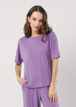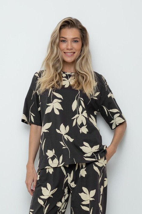 Свободная футболка из набивного трикотажа супрем. Спущенное плечо придает изделию свободный силуэт.