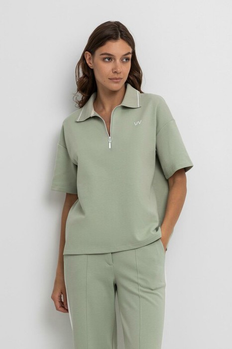Джемпер поло с короткими рукавами с принтом и вязаным воротником из плотного гладкого трикотажа интерлок с застежкой на молнию . Спущенное плечо придает изделию свободный силуэт.