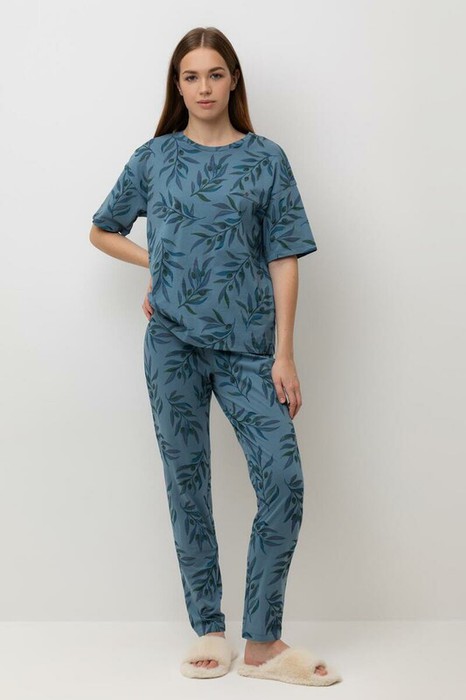 Легкий комплект для комфортного сна и отдыха из натурального хлопка. Футболка с карманом и спущенной линией плеча комфортно садится по фигуре. Брюки с поясом на резинке выполнены из набивного трикотажа. Гладкий материал приятен к телу и позволяет коже дышать.