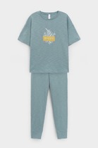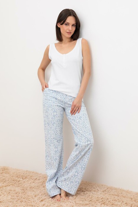 Комплект для комфортного сна из трикотажного полотна. Майка с декоративной планкой с пуговицами из эластичного трикотажа с добавлением лайкры. Брюки с нежным рисунком и мягким поясом на резинке удобно садятся по фигуре. Гладкий материал приятен к телу, не теряет форму и позволяет коже дышать.