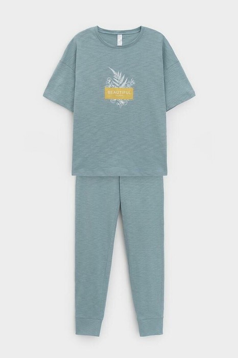 Легкий комплект для комфортного сна и отдыха.  Футболка с принтом и спущенной линией плеча комфортно садится по фигуре.  Брюки с эластичными манжетами с боковыми карманами. Круглый шнур позволяет регулировать посадку. Гладкий материал приятен к телу и позволяет коже дышать.