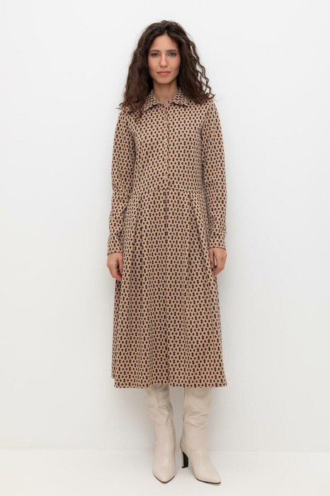 Платье с воротником из плотного набивного трикотажа интерлок. Модель с длинными рукавами и юбкой в складку.     Все трикотажные полотна производятся в соответствии с нормами Швейцарского сертификата ЭкоТекс. Сделано в России