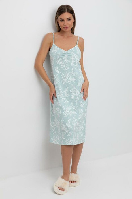 Элегантная женская сорочка с регулируемыми бретелями для комфортного сна. На груди декоративная сборка. Гладкий материал приятен к телу и позволяет коже дышать.